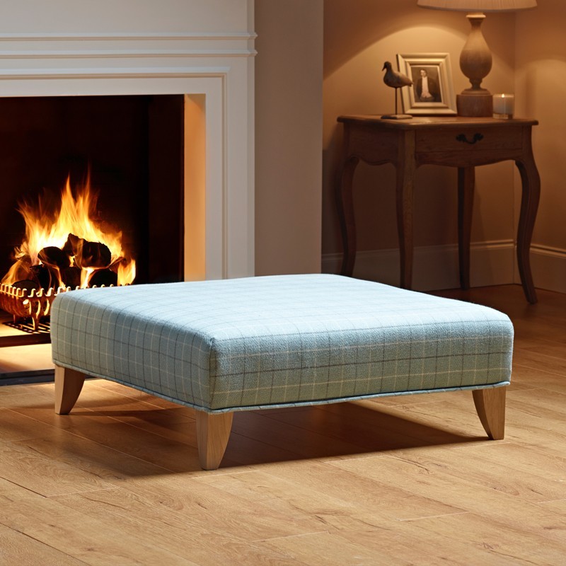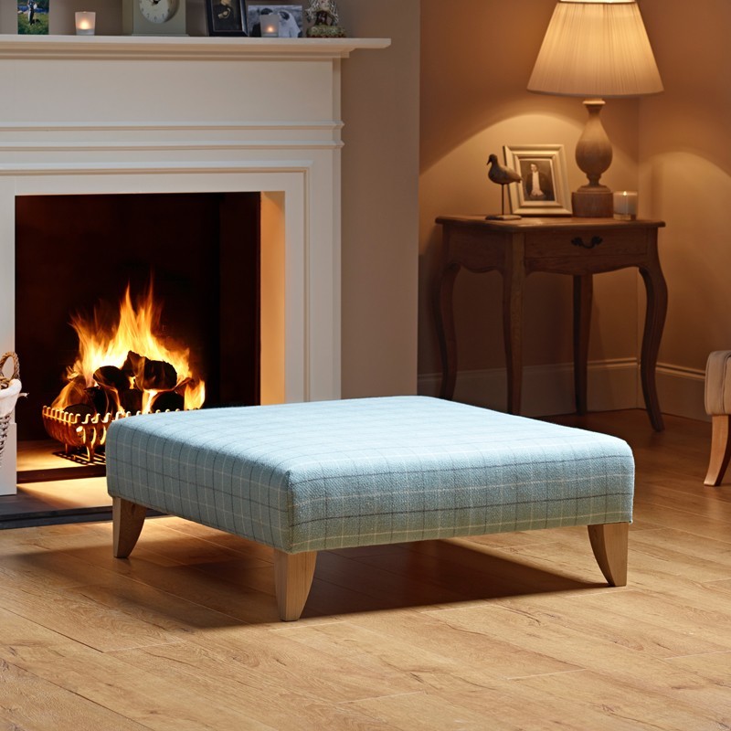 Arden Plain Top Footstool 91 x 91cm (36 x 36") Clarke & Clarke Gama Aqua - 15.2cm (6") Convex Tapered Leg Oiled Oak