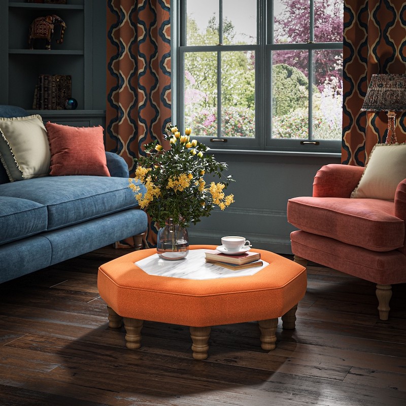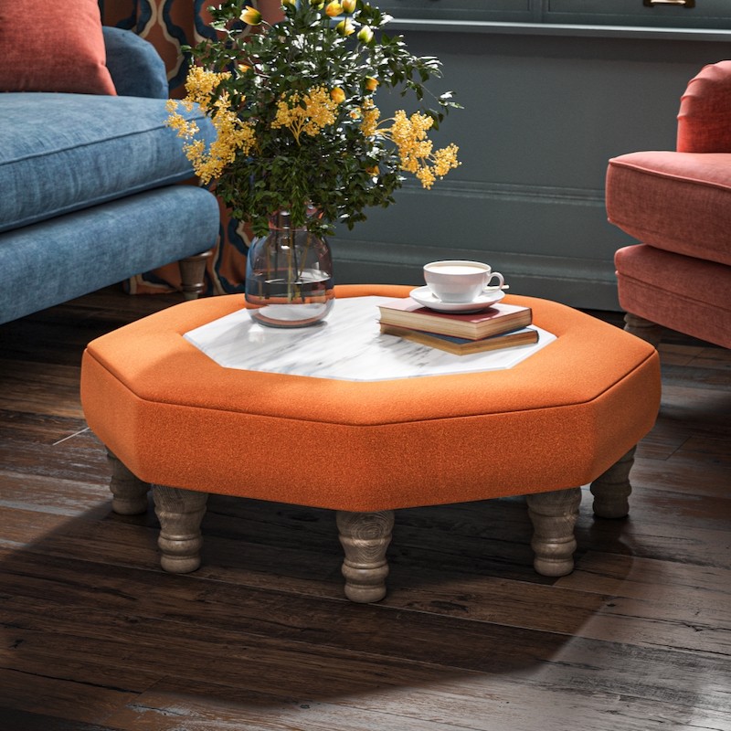 A fusion of a square and circular ottoman, the Delamere octagon oozes effortless character. An Arabescato Italian Marble lid insert enhances its practicality, creating a safe place for drinks, nibbles and flower arrangements.