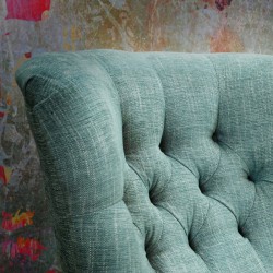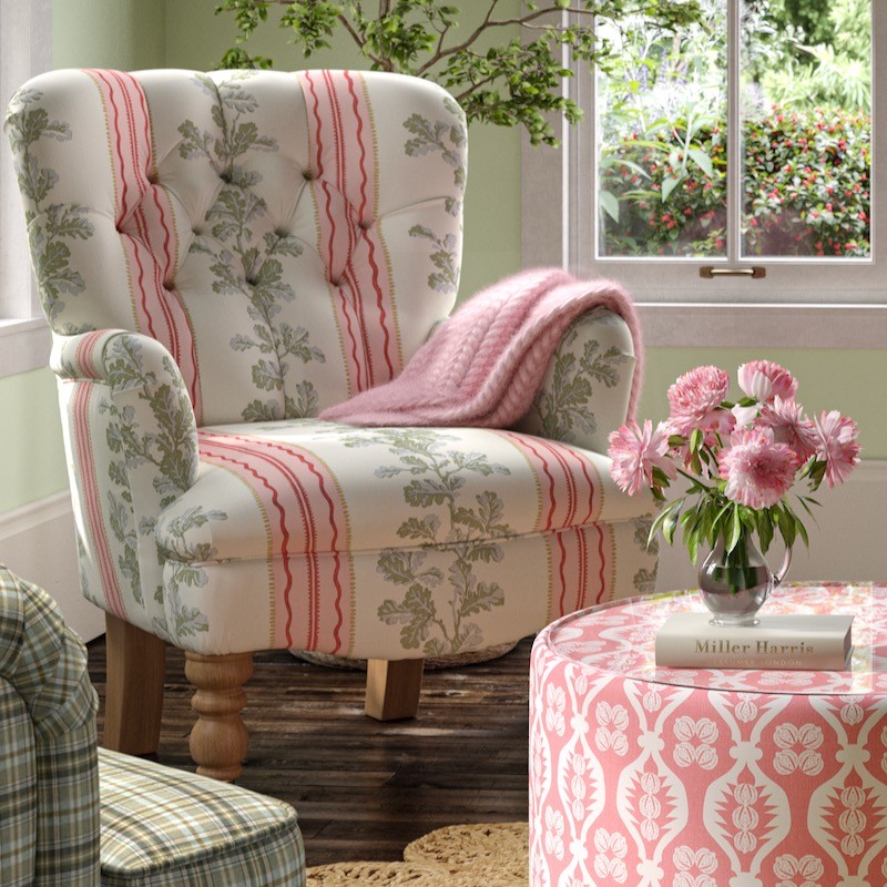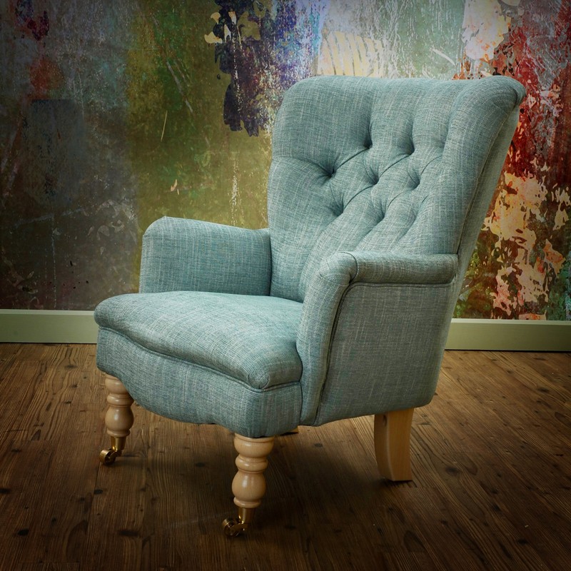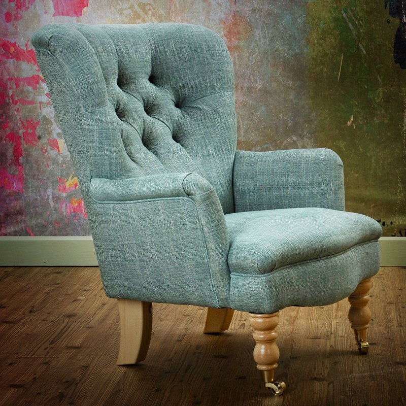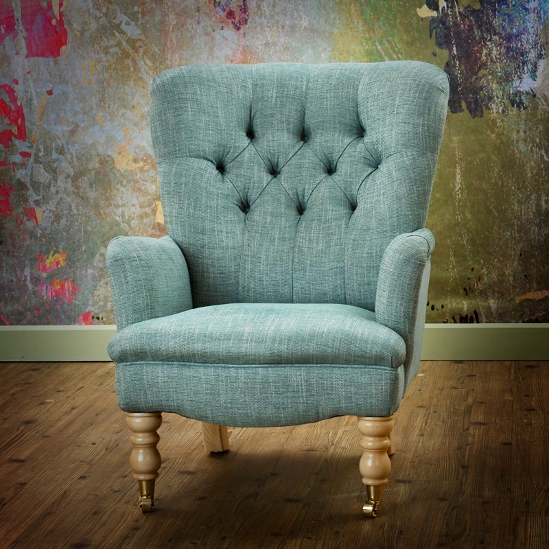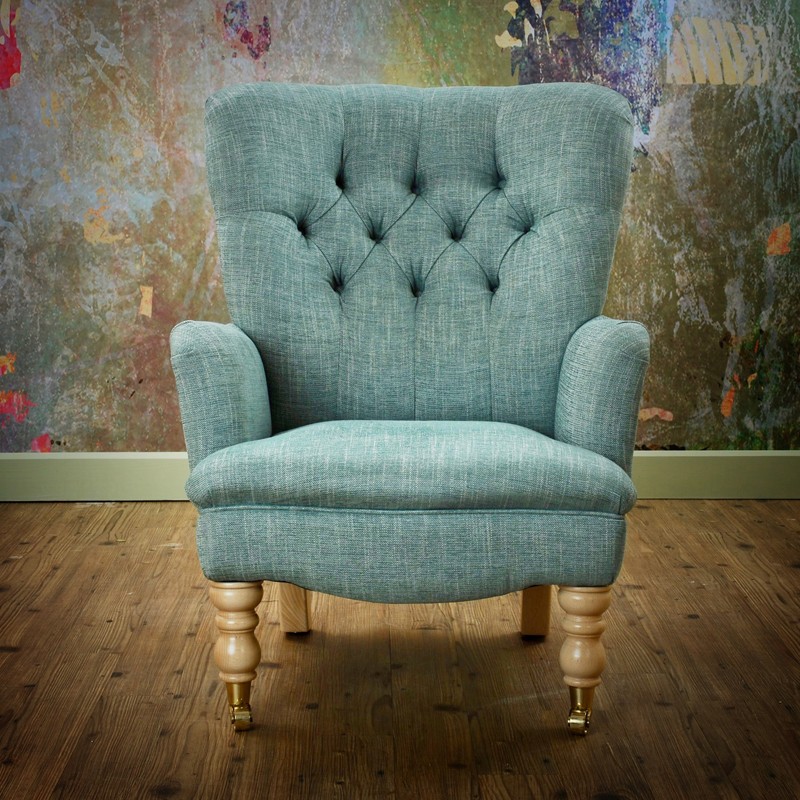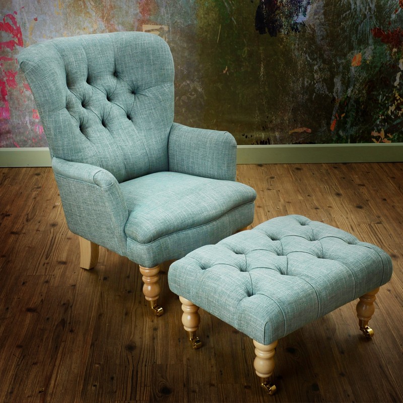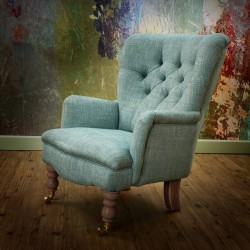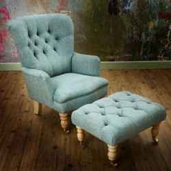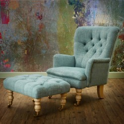 The Nairn is a pretty little chair with a deep buttoned back and optional matching footstool with a turned castor leg.