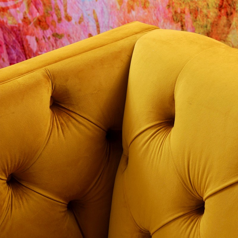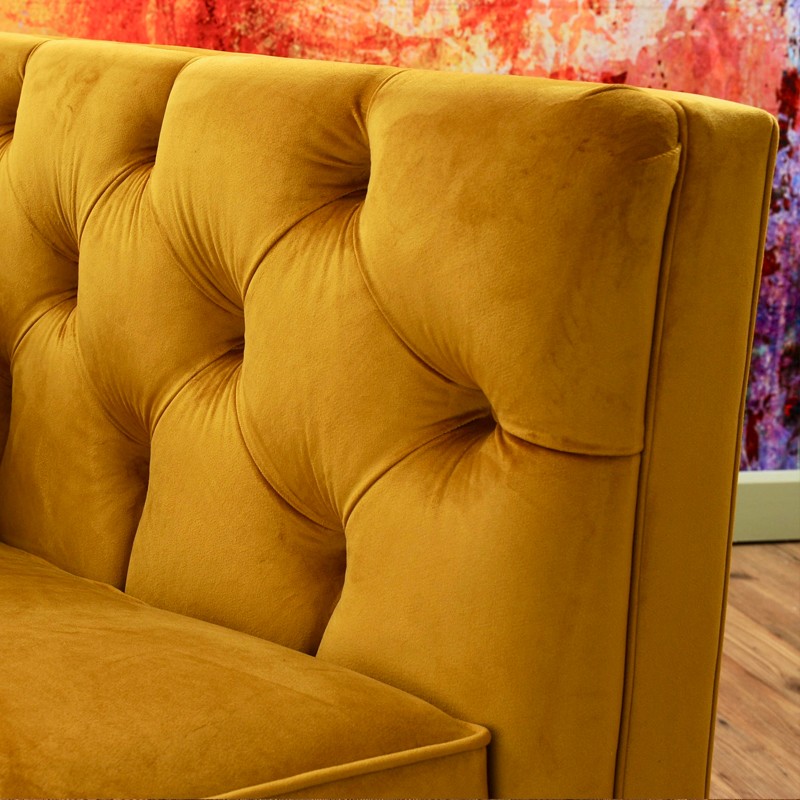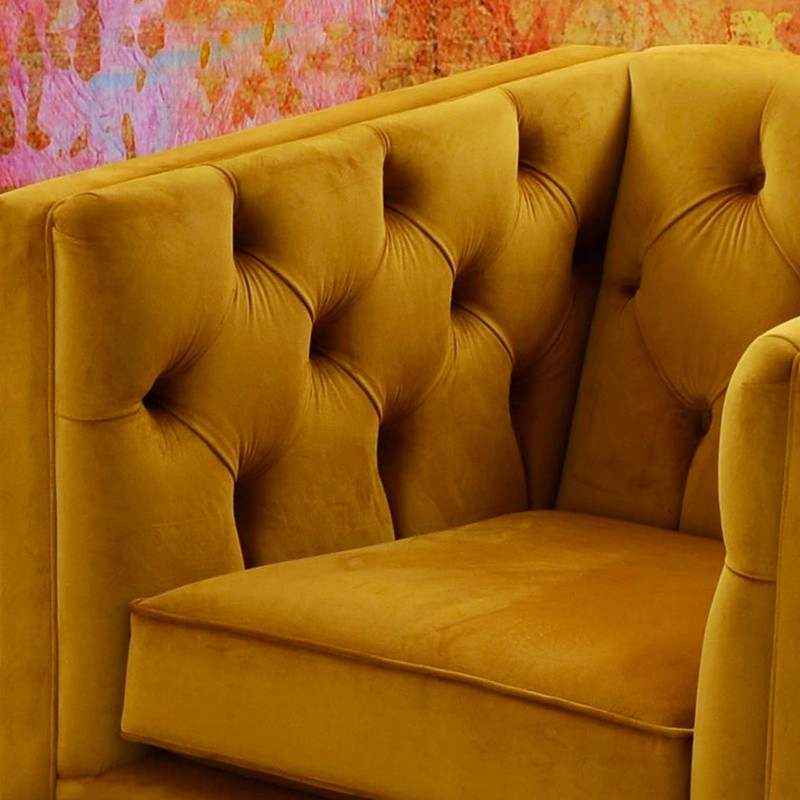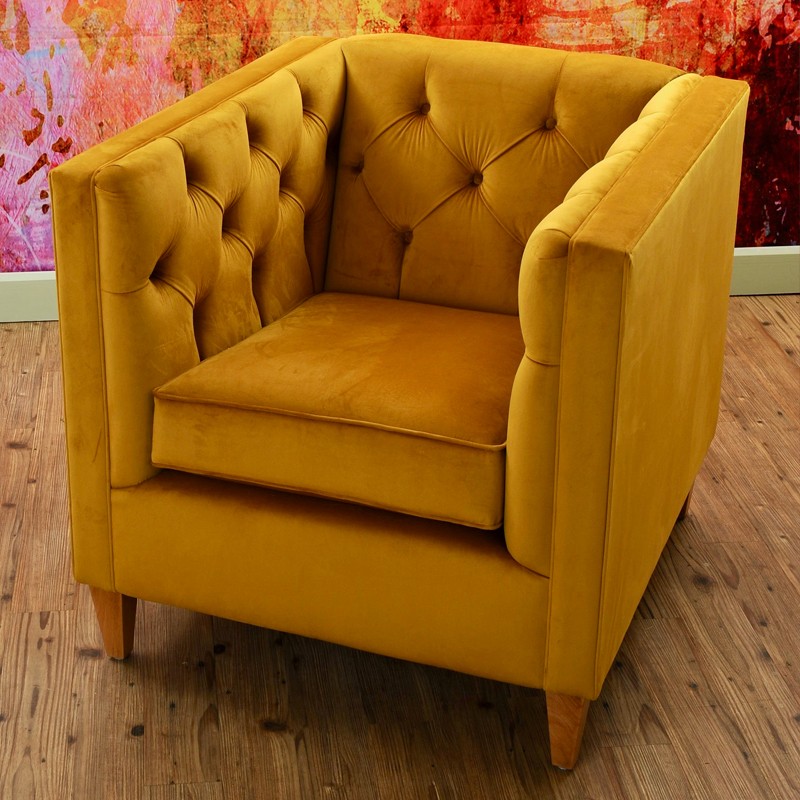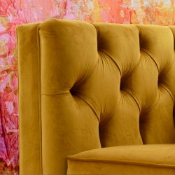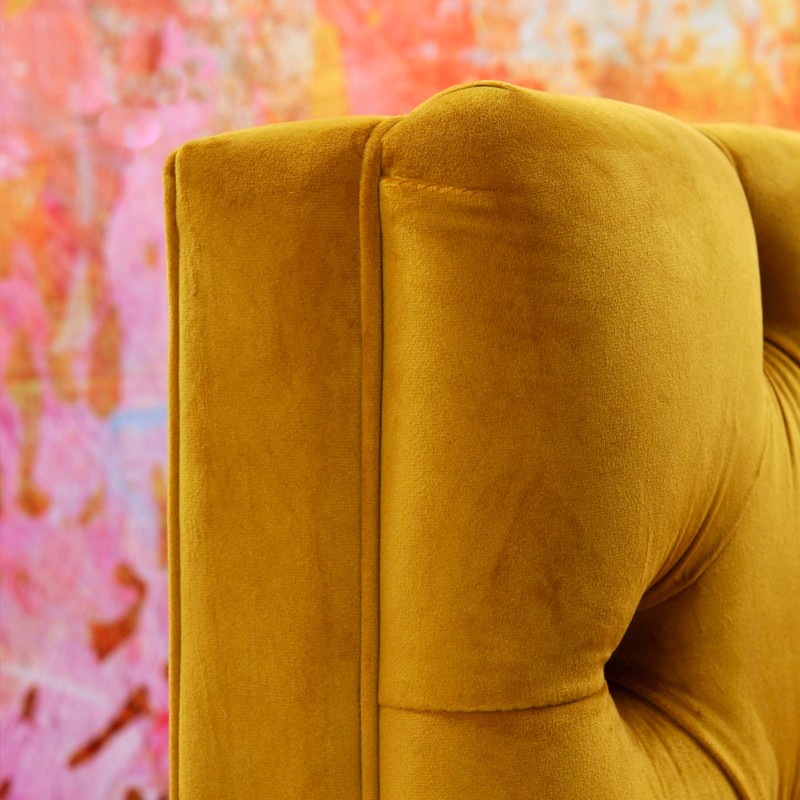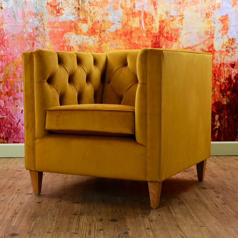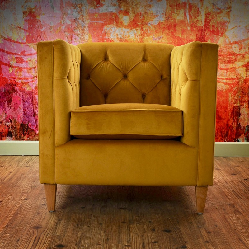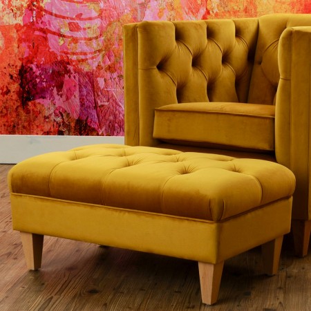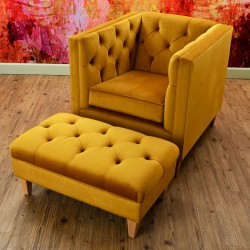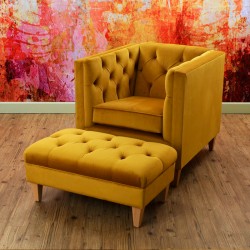 The Teviot Chair combines classic deep buttoning with a contemporary high sided square seat shape to give a luxury hotel feel. Paired with its matching footstool, the combination is modern and fun.