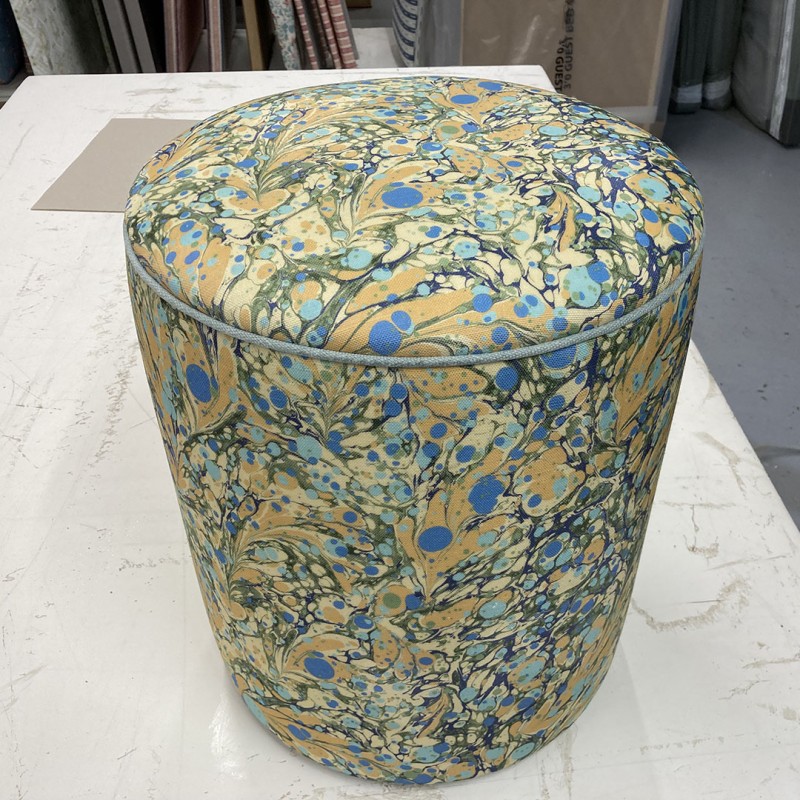 An expertly upholstered drum stool with a smart piped edge in luxury House of Amitié Juniper Neptune Linen. This Florence Drum Stool features piping in a co-ordinating plain.