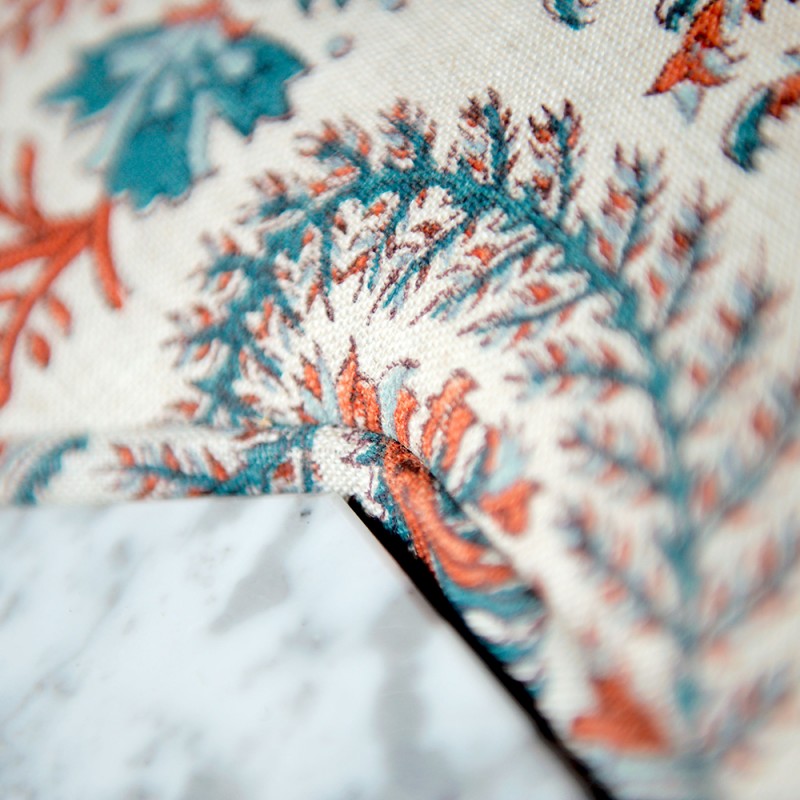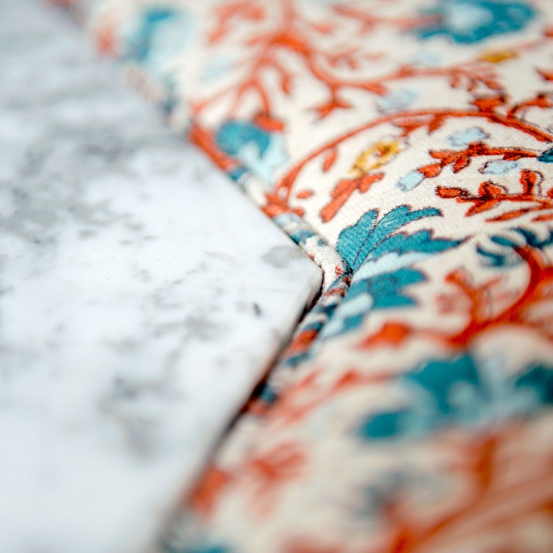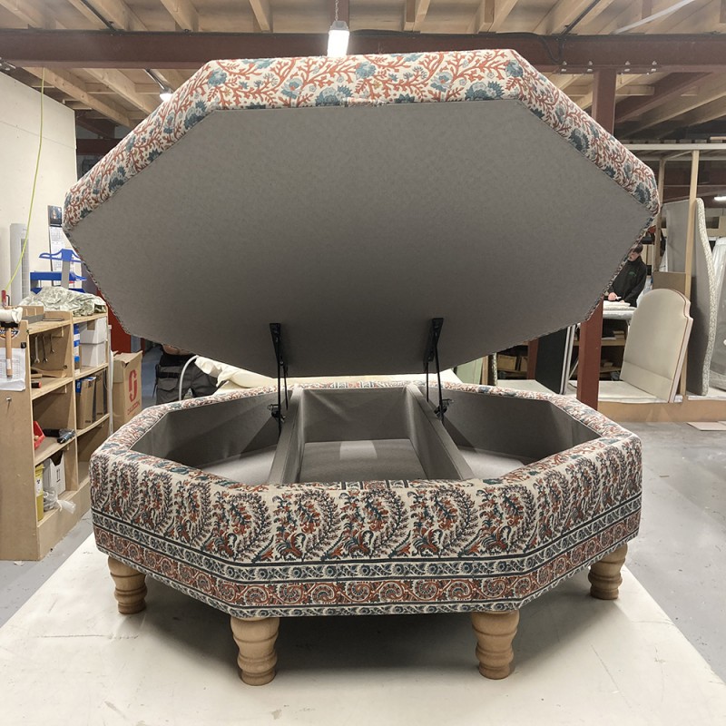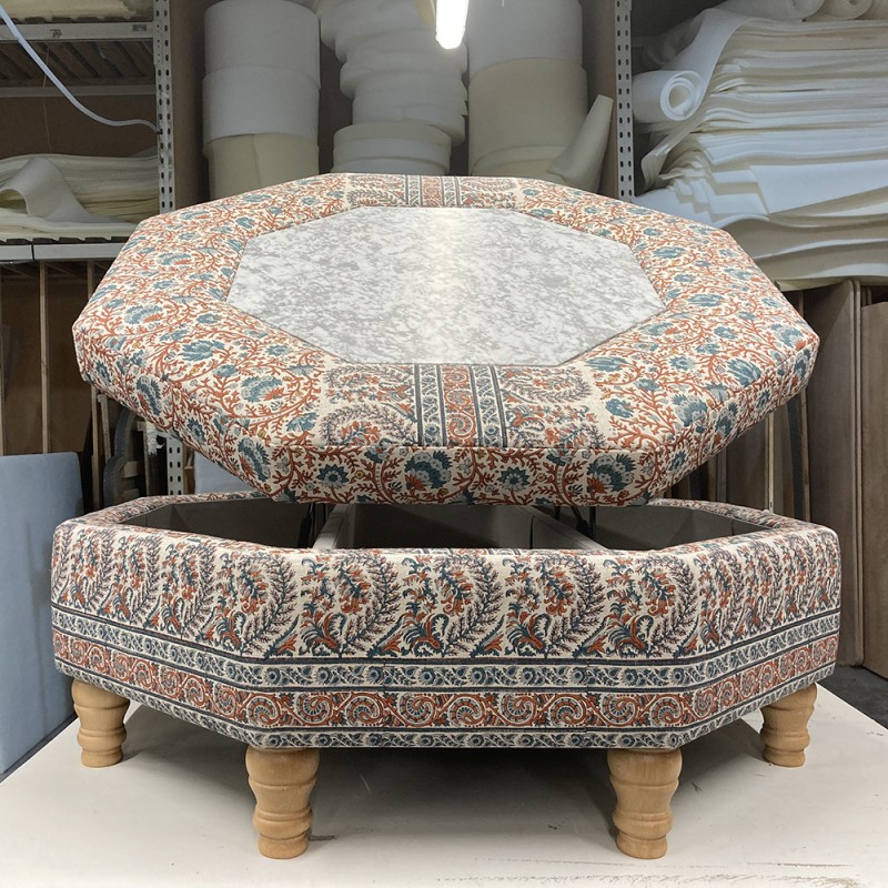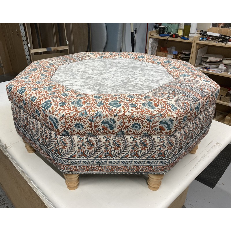 The rarest of opportunities to own our photoshoot/development Delamere Octagonal Storage Ottoman in Ian Sanderson Mallow Border Cortez with genuine Italian Carrera marble insert.