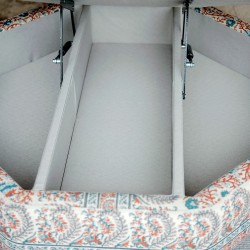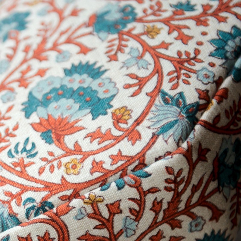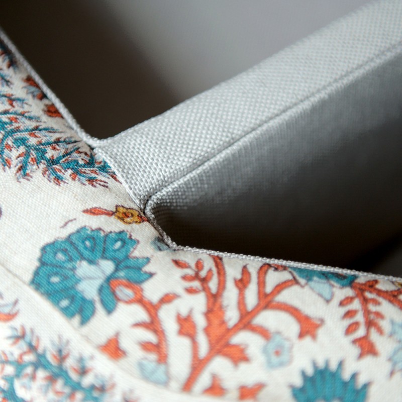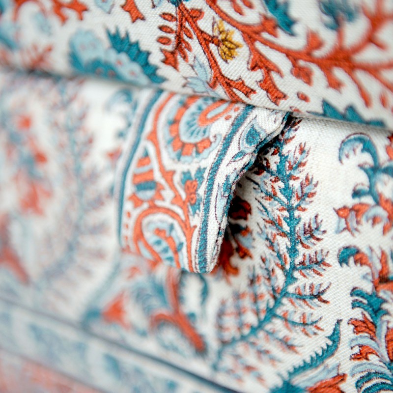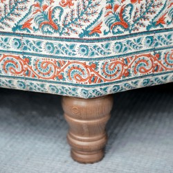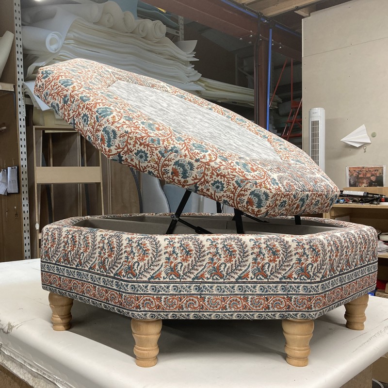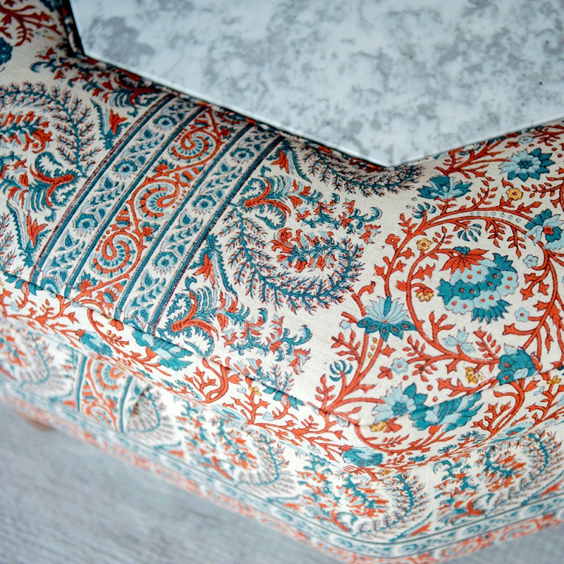This development model has been designed by our stylist to show off what can be done with an interesting fabric that can be 'deconstructed' to be used in different orientations according to the ottoman's surfaces. Note how the border motif of the material has been turned sideways to form the sides of the ottoman.