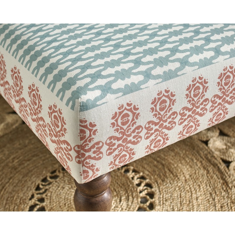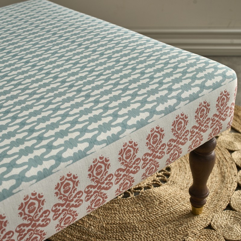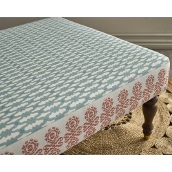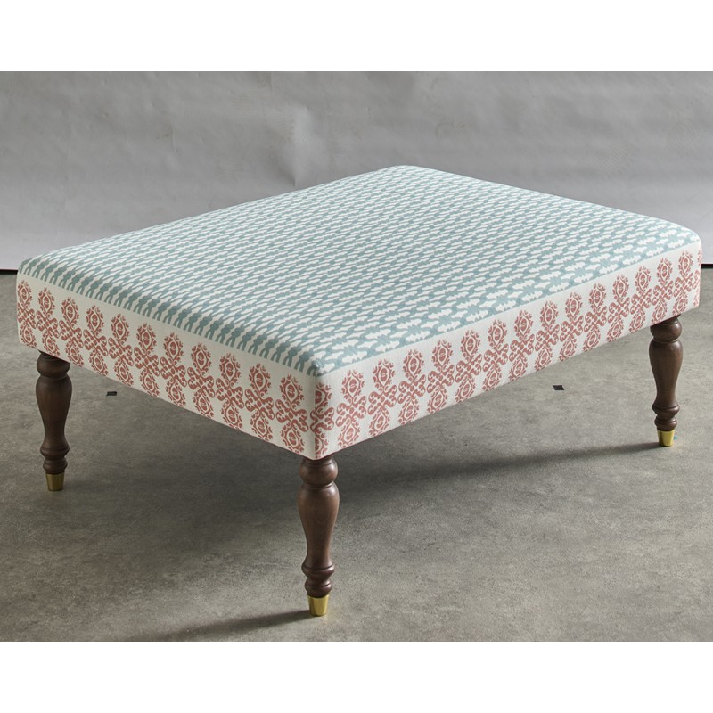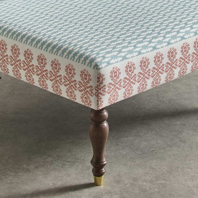 A smart plain top ottoman in designer, luxury Charlotte Gaisford fabric. This piece is a development and ex-photography item from the launch of our exclusive, inspirational collaboration with Charlotte. Charlotte has designed the fabric with an co-ordinating border specifically to wrap the sides of the Arden Ottoman for a unique finish. These special licensed fabric combinations are ONLY available from The Ottoman Workshop!