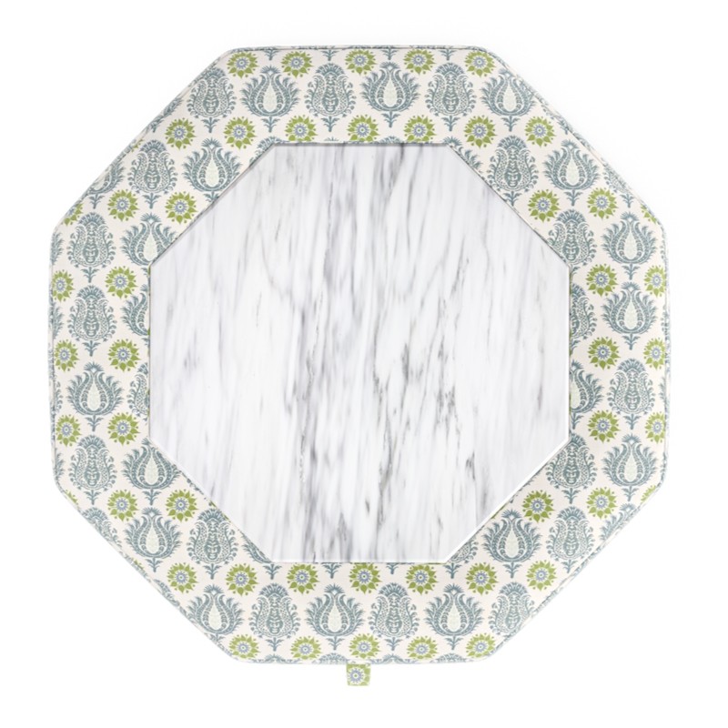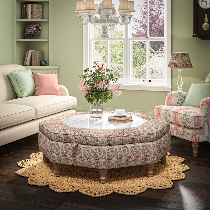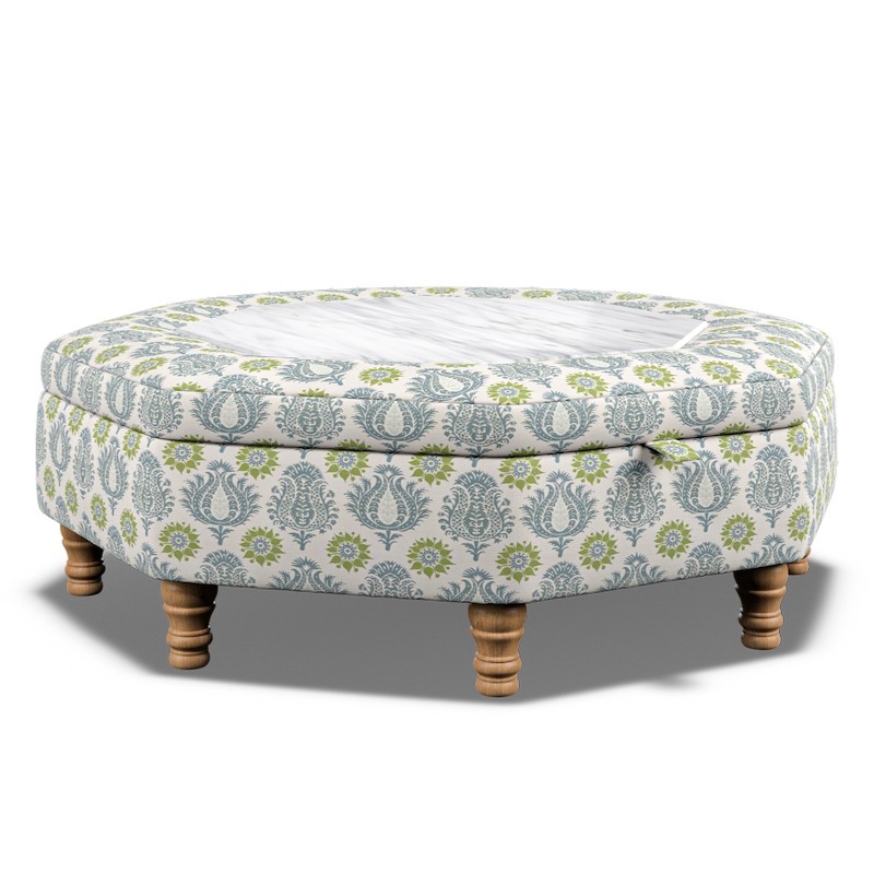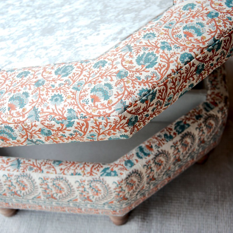 Delamere Octagonal Storage Ottoman 121cm (48") with Arabescato Italian Marble Inlay in Ian Sanderson Mallow Border Cortez - Top Edge Backtacked - 12.7cm (5") Turned Leg Oak - No Trim