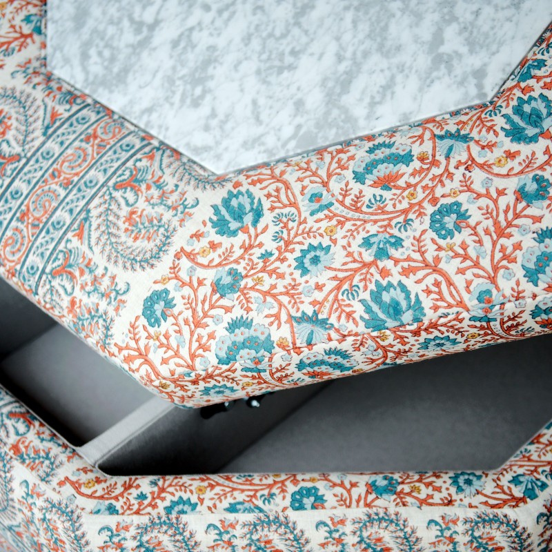 Delamere Octagonal Storage Ottoman 121cm (48") with Arabescato Italian Marble Inlay in Charlotte Gaisford Sharanshar Storm - Top Edge Backtacked - 12.7cm (5") Turned Leg Oak - No Trim