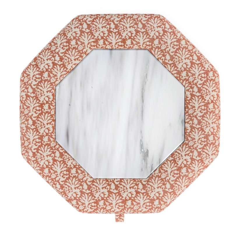 An elegant eight-sided octagonal ottoman with useful storage and practical Arabescato Italian Marble inlay for drinks, games and décor.