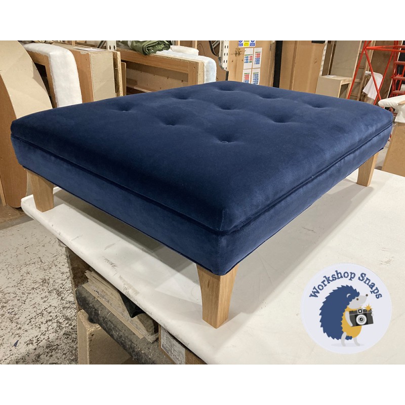 Fernworthy Shallow Buttoned Footstool with Border 102 x 76cm (40 x 30") COM Kai Como Navy - Single Piped Trim - 6ins Concave Tapered Oiled Oak Leg 6244