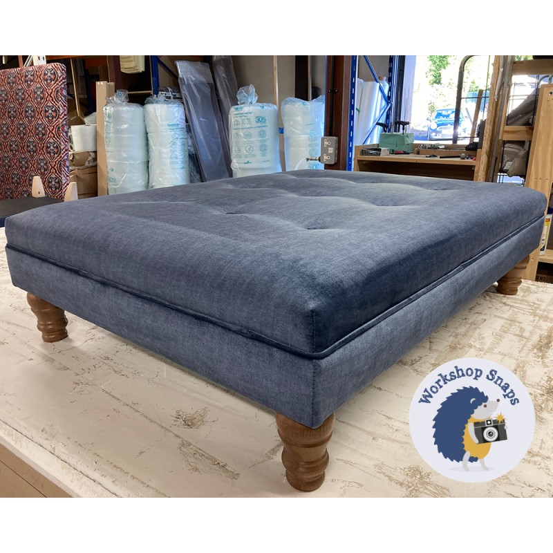 Fernworthy Shallow Buttoned Footstool with Border 102 x 76cm (40 x 30") COM Tinsmiths Ashmore Eco Indigo - Vintage Corner Stud Trim - 6ins Concave Tapered Oiled Oak 8272
