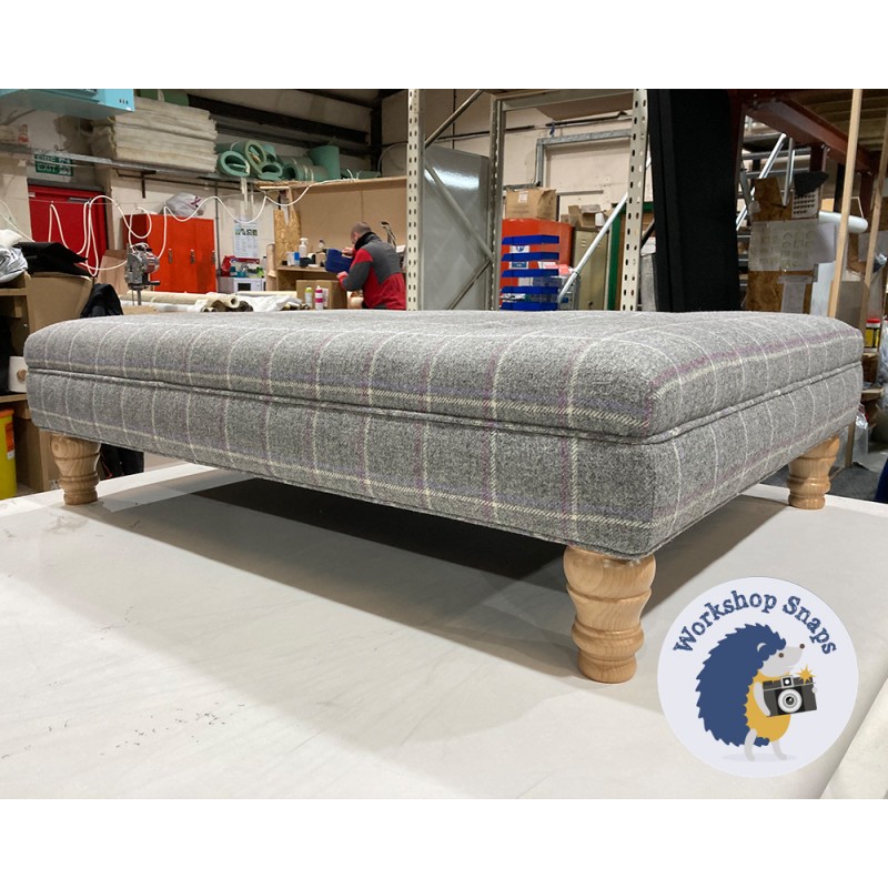 Fernworthy Shallow Buttoned Footstool with Border 102 x 76cm (40 x 30") Wool Check Grey - Single Piped Trim - 5ins Turned Natural Leg 6479