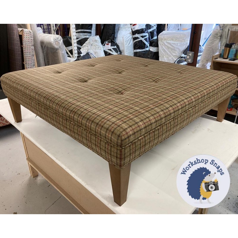 Fernworthy Shallow Buttoned Footstool with Border 122 x 122cm (48 x 48") Wool Check Sage - Piped Trim - 9ins Tapered Oak Leg 6942