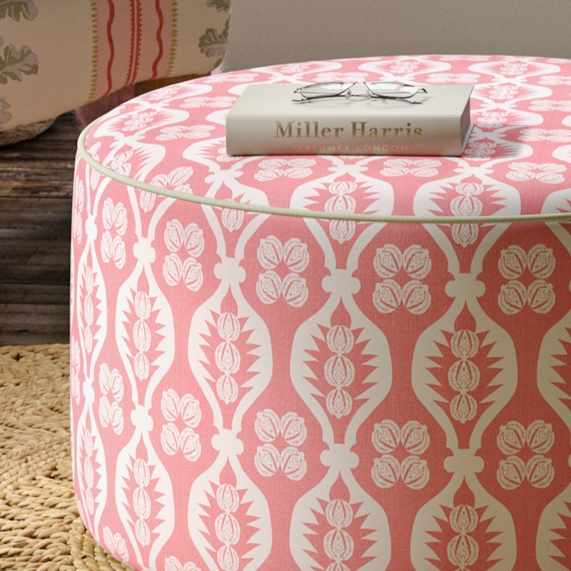 Florence Upholstered Top with Piping Drum Stool 61 x 33cm (24 x 13") in Charlotte Gaisford Georgie Girl 2 Pink - Contrast Piped in House Cotton Vanilla - No Trim