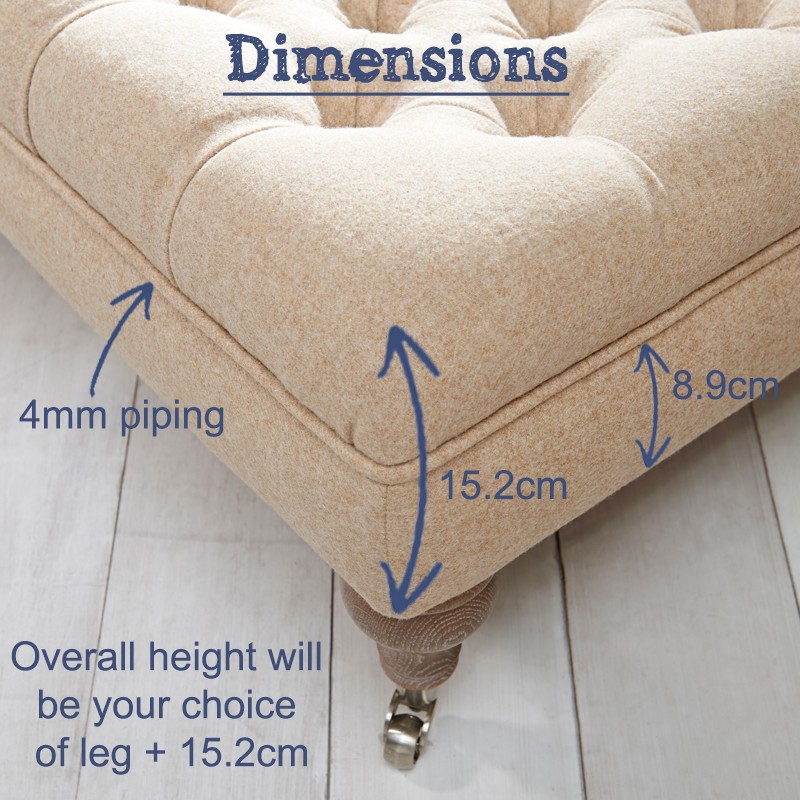 The height of compatible legs for this footstool is between 4 and 9 inches. Wooden legs are made from either beech or oak.