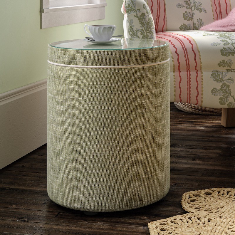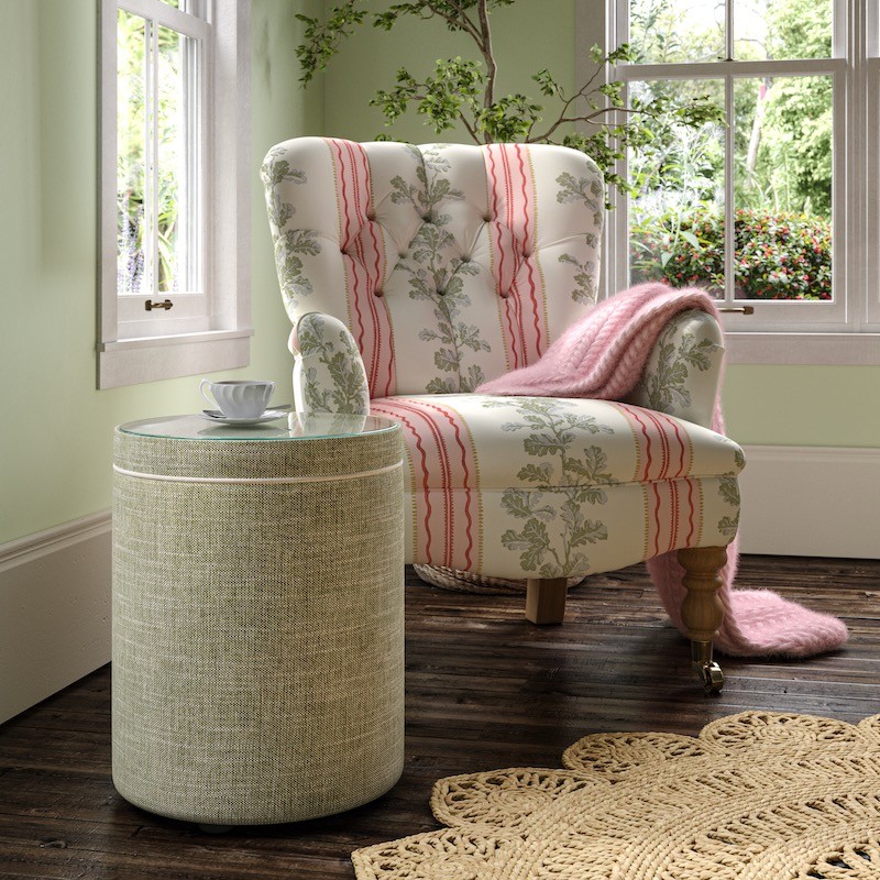 With its removable toughened glass insert and piped border, the Gosford round drum stool is ideal for use as a fabric coffee table or bedside table. Fabrics can be mixed and matched on the top, sides, header bad and piped border for visual impact. Low profile glides to the base ensure it is practical for both hard and soft flooring surfaces.