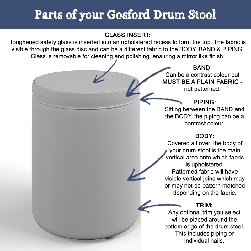 A glass topped drum stool with piped band. Please note; if choosing a patterned fabric for this Gosford Drum Stool, the BAND will need to be in a plain fabric. We will contact you once your order is placed if your fabric configuration needs changing, alternatively please call us on 01291 629764 and we'll be happy to assist.