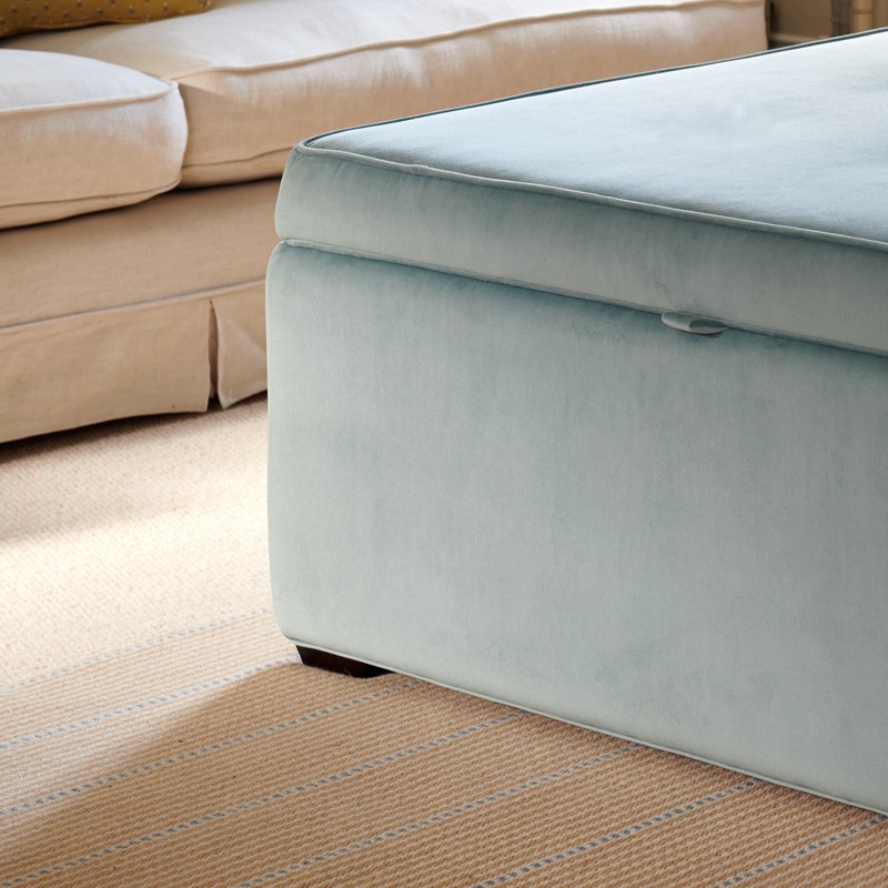 Image for style reference; Greenwood Plain & Piped Lid Full Depth Storage Footstool in Soft Velvet Sky
