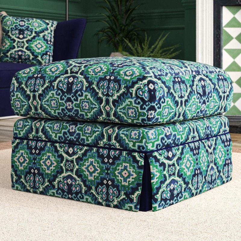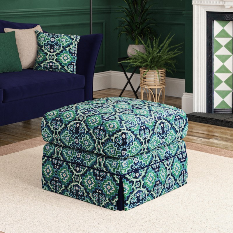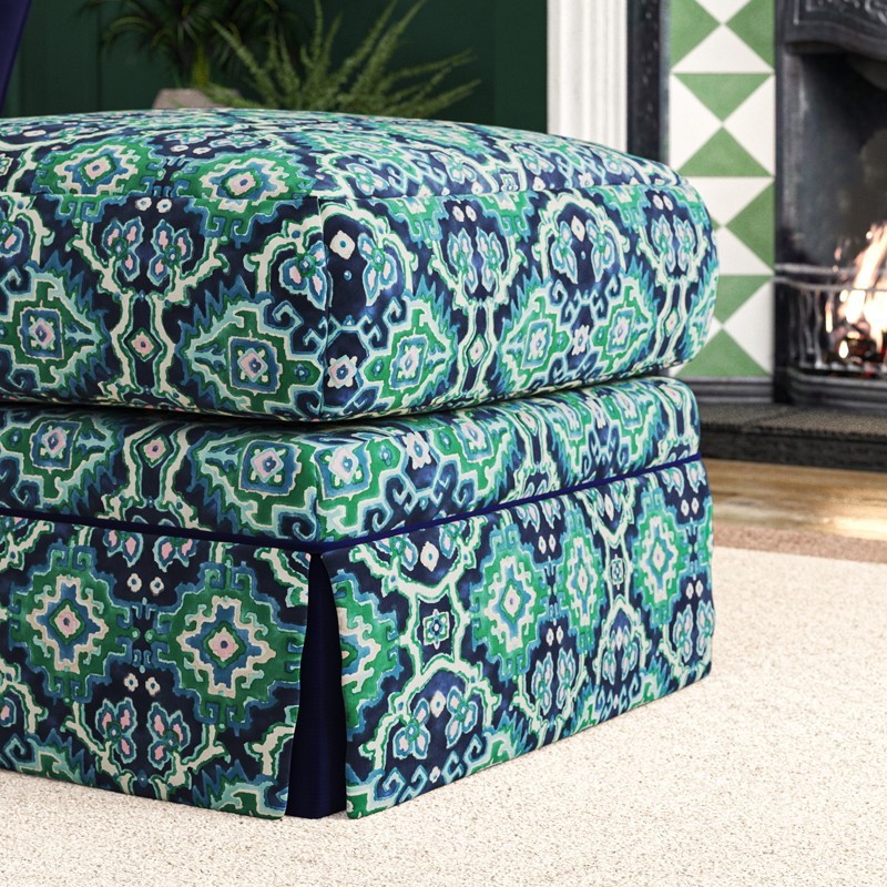 Kielder Valanced Footstool 69 x 69cm (27 x 27") in Linwood Printed Velvet Kami Seagreen - Contrast Reveal