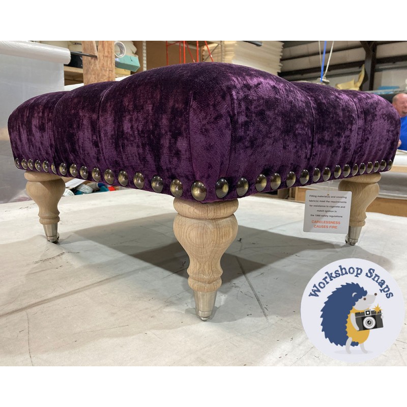 Kinver Deep Buttoned Footstool 61 x 61cm (24 x 24") Crushed Velvet Aubergine - Full Vintage Studs - 7.5ins Castor Leg Washed Oak 5245