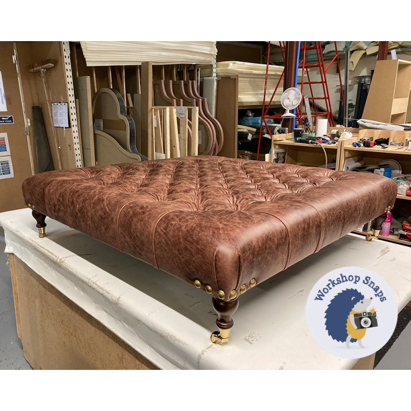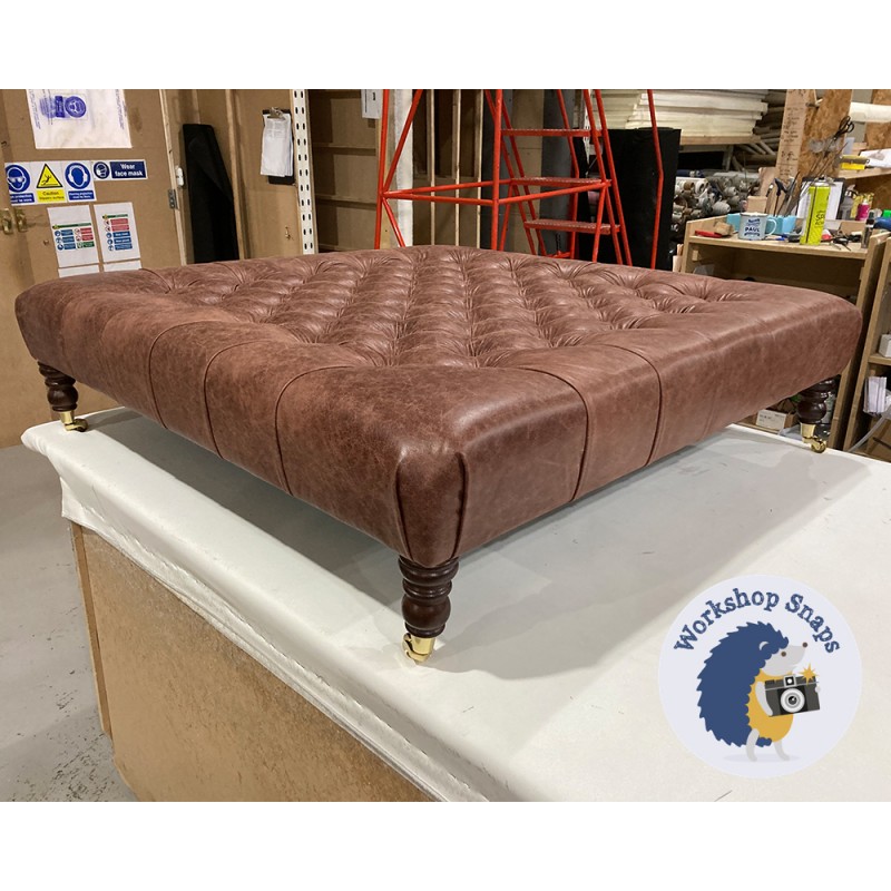 Kinver Deep Buttoned Footstool 122 x 122cm (48 x 48") Antique Matt Leather Bridle - 6ins Castor Mahogany Leg 8020