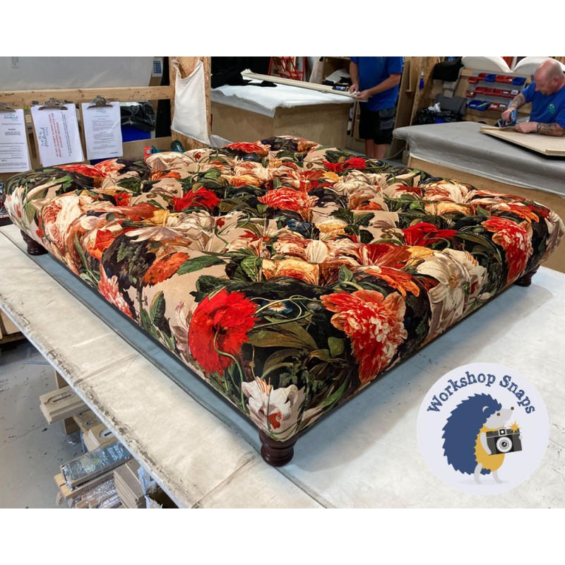 Kinver Deep Buttoned Footstool 122 x 122cm (48 x 48") COM Jane Clayton Floral Pompadour Velvet - Single Piped Trim - 4ins Turned Leg Mahogany 5214