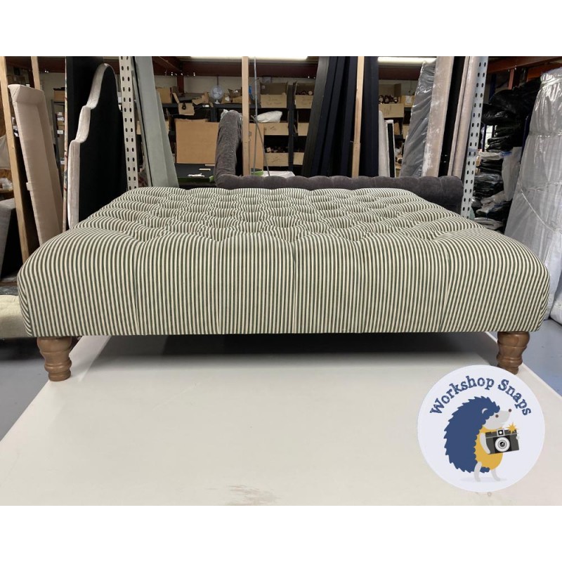 Kinver Deep Buttoned Footstool 122 x 122cm (48 x 48") COM Ticking Stripe Alpha Dark Green - Pad Height Increased to 8ins - 5ins Turned Oak Leg 7365