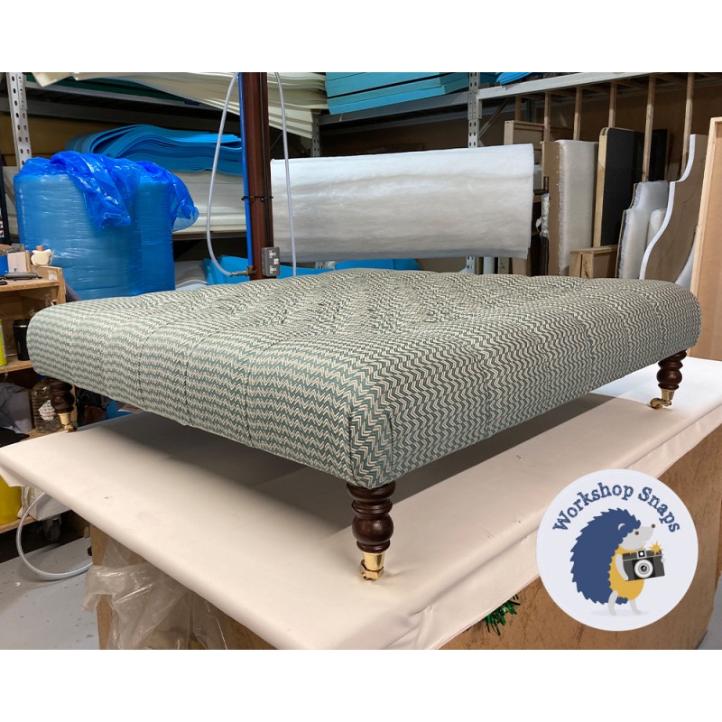 Kinver Deep Buttoned Footstool 122 x 122cm (48 x 48") COM Sanderson Herring Pacific - 7ins Castor Mahogany Leg 8140