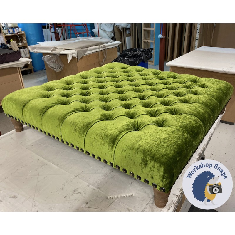 Kinver Deep Buttoned Footstool 122 x 122cm (48 x 48") Crushed Velvet Pistachio - Full Vintage Stud Trim - 5ins Turned Oak Leg 7417