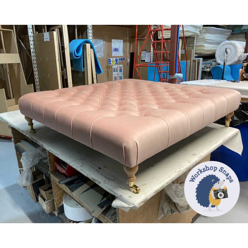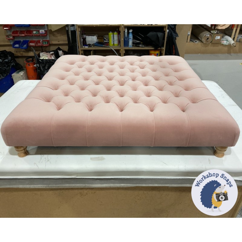 Kinver Deep Buttoned Footstool 122 x 122cm (48 x 48") Flat Velvet Blush - 4ins Turned Natural Leg 6180