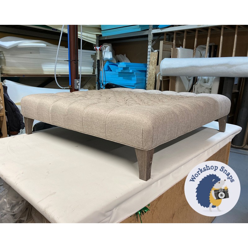 Kinver Deep Buttoned Footstool 122 x 122cm (48 x 48") Textured Weave Stone - Single Piped Trim - 6ins Concave Tapered Washed Oak Leg 8330