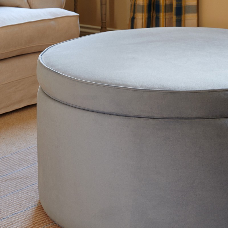 Our unique Thetford Plain & Piped Lid Full Depth Round Storage Ottoman 76cm (30") is handmade to order. Featuring a drop in lid for easy opening this medium sized round storage stool offers a practical and modern solution for storing your belongings beautifully!