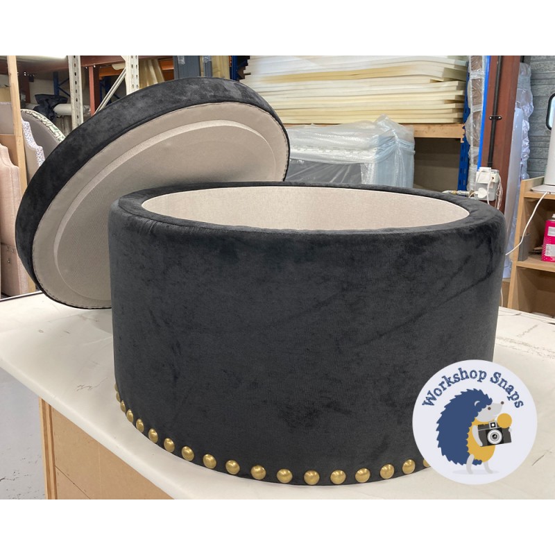 This footstool features a plain top and a fully removable, piped lid, with a black internal lining cloth.