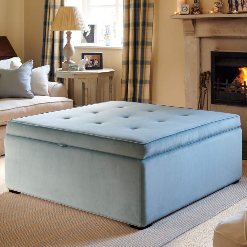 Image for style reference; Whinfell Shallow Buttoned & Piped Lid Full Depth Storage Footstool in Soft Velvet Sky
